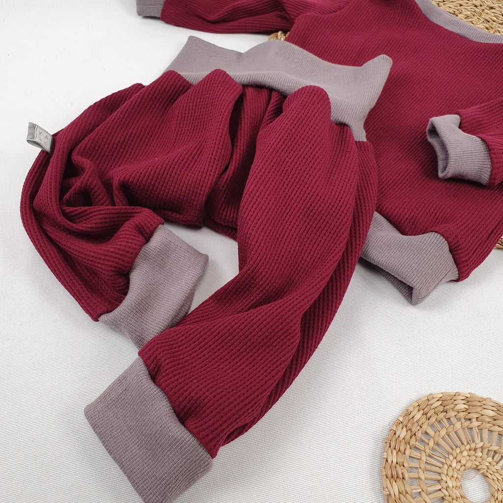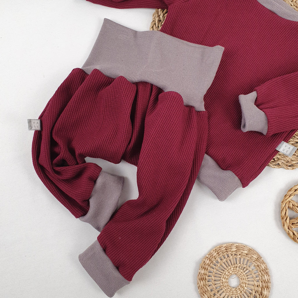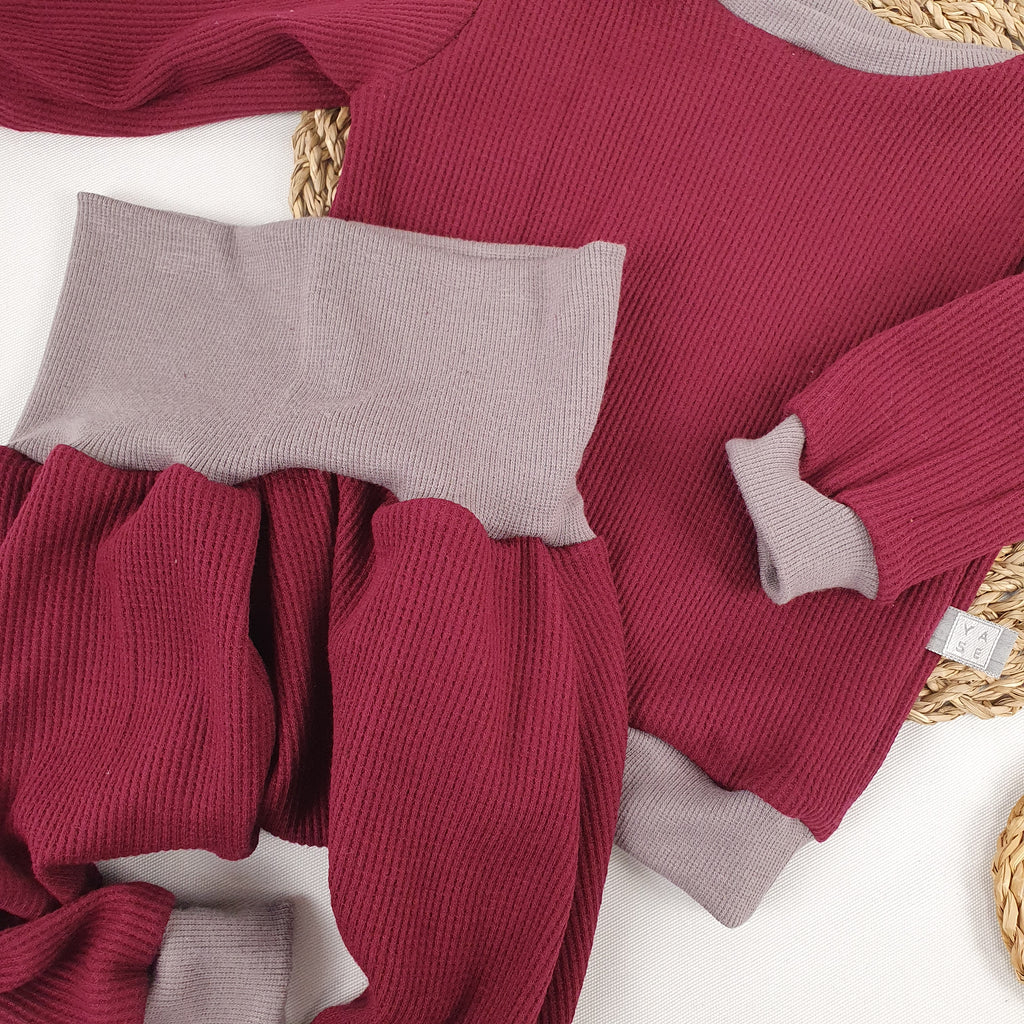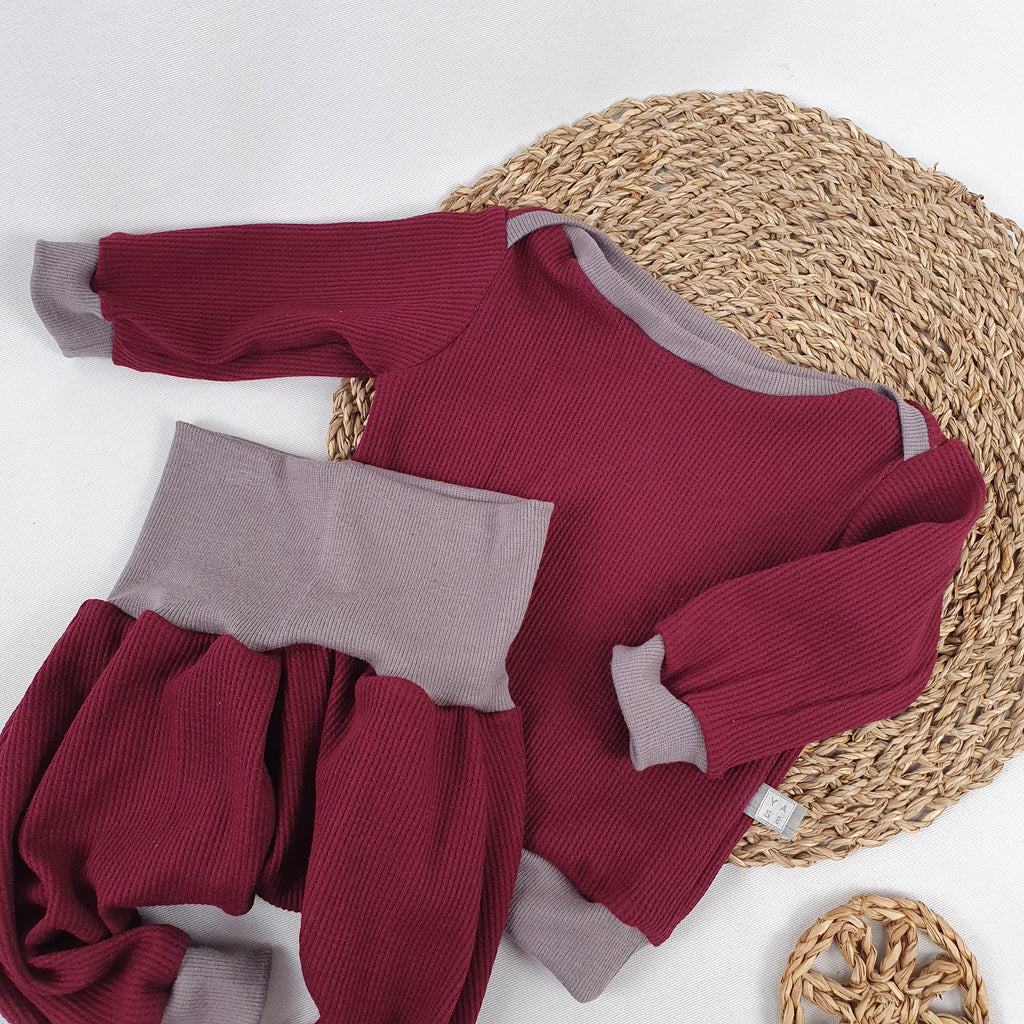This cozy set features a baggy pants and a matching sweater, ideal for relaxing at home or stepping out in style during the spring or fall. The roomy pants comfortably accommodate a diaper, with cuffs that can be worn wide or rolled up for a personalized fit. The sweater’s neckband overlaps at the shoulders, making dressing and undressing effortless. Embrace comfort without sacrificing charm with this versatile combo.